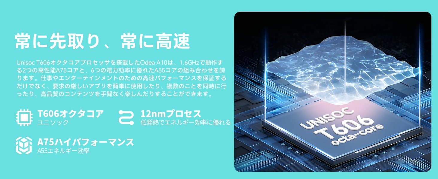 Unisoc T606オクタコアプロセッサを搭載したODEA A10は、1.6GHzで動作する2つの高性能A75コアと、6つの電力効率に優れたA55コアの組み合わせを誇ります。仕事やエンターテインメントのための高速パフォーマンスを保証するだけでなく、要求の厳しいアプリを簡単に使用したり、複数のことを同時に行ったり、高品質のコンテンツを手間なく楽しんだりすることができます。