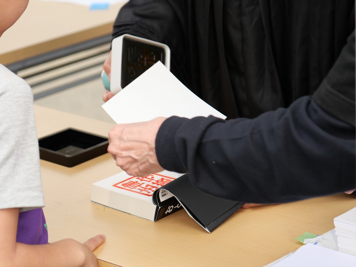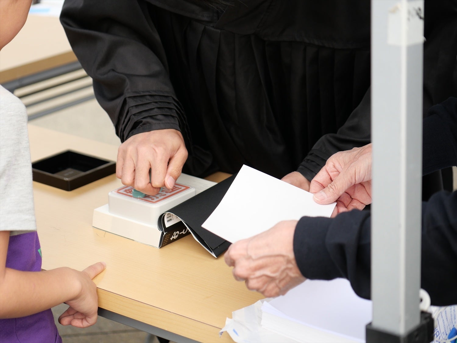 続いて15時ごろからは、岡野弁護士が書店員に扮して書籍を手渡しする「即売会」と、のりちゃんが裁判官に扮して書籍に「法律厳守」のスタンプを押す「スタンプ会」がそれぞれ行われました。