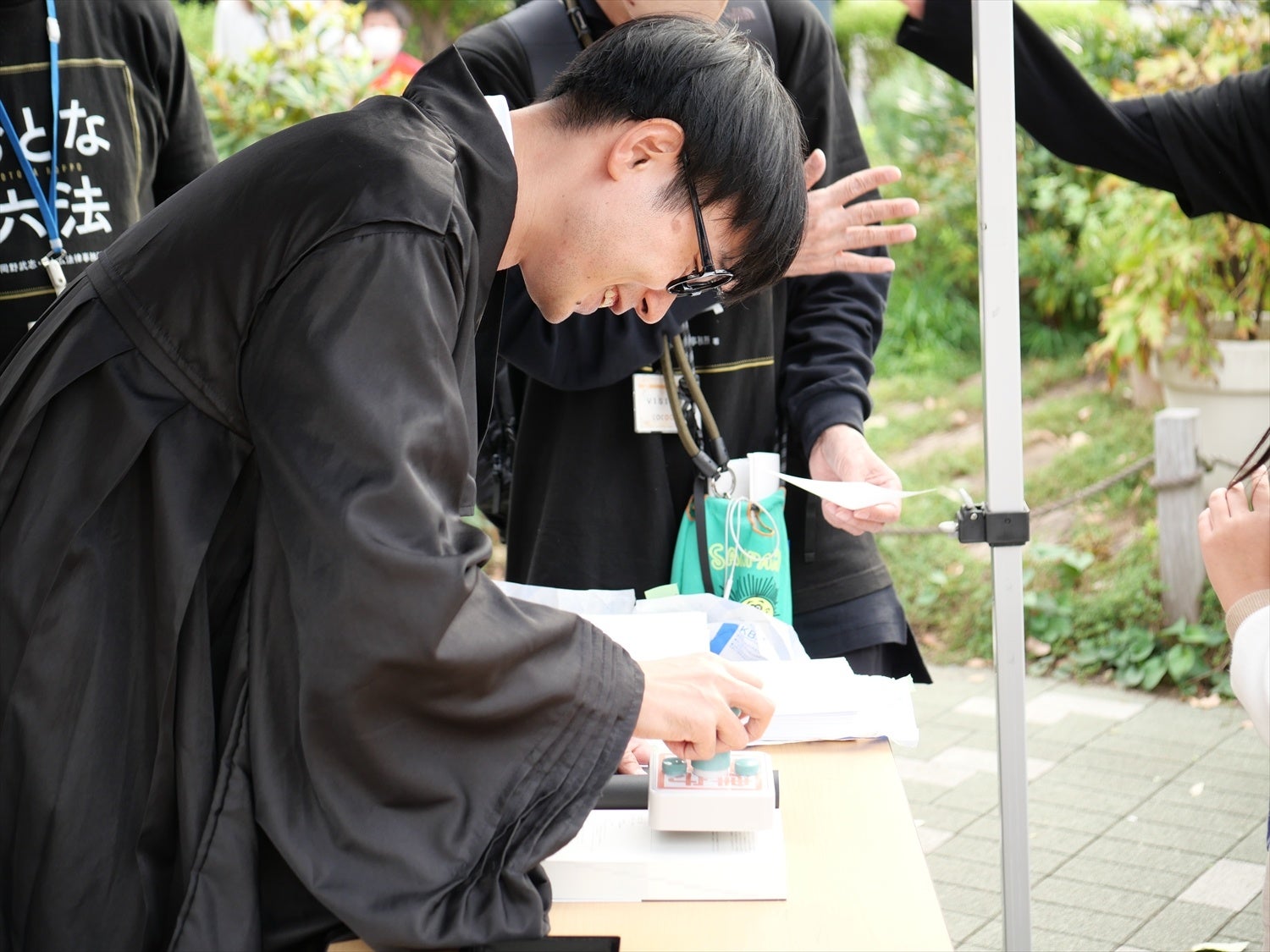 ▲ 裁判官のコスプレで、動画の合言葉でもある「法律厳守」のスタンプを一冊ずつ、3時間以上にわたって押し続けたのりちゃん