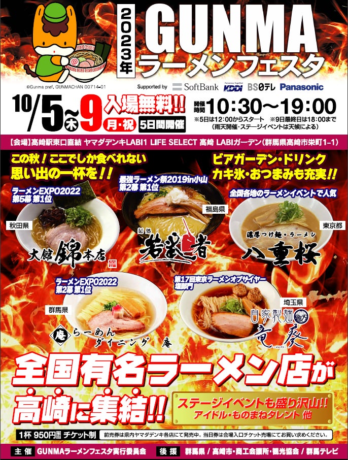 全国有名ラーメン店が集結!群馬県初開催!「GUNMAラーメンフェスタ 2023」2023年10月5日(木) ~ 10月9日(月・祝)