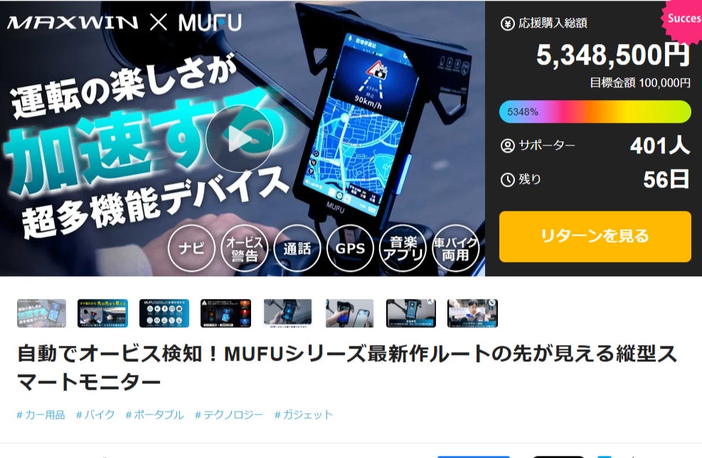 カー用品・バイク用品ブランドMAXWIN(運営:昌騰有限会社、所在地:大阪府岸和田市)は、GPSを搭載した、自動オービス検知システム付きの縦型スマートモニター『MF-MS1000』を、2025年7月2日より応援購入サービス Makuakeにて先行販売開始し、わずか5秒で目標を達成、1日で総額5,348,500円達成率5348%を記録しました。