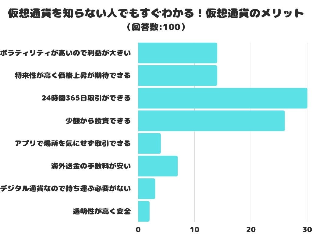 仮想通貨を知らない人でもすぐわかる!仮想通貨のメリットをアンケートにて調査したところ、1位は「24時間365日取引ができる」でした。