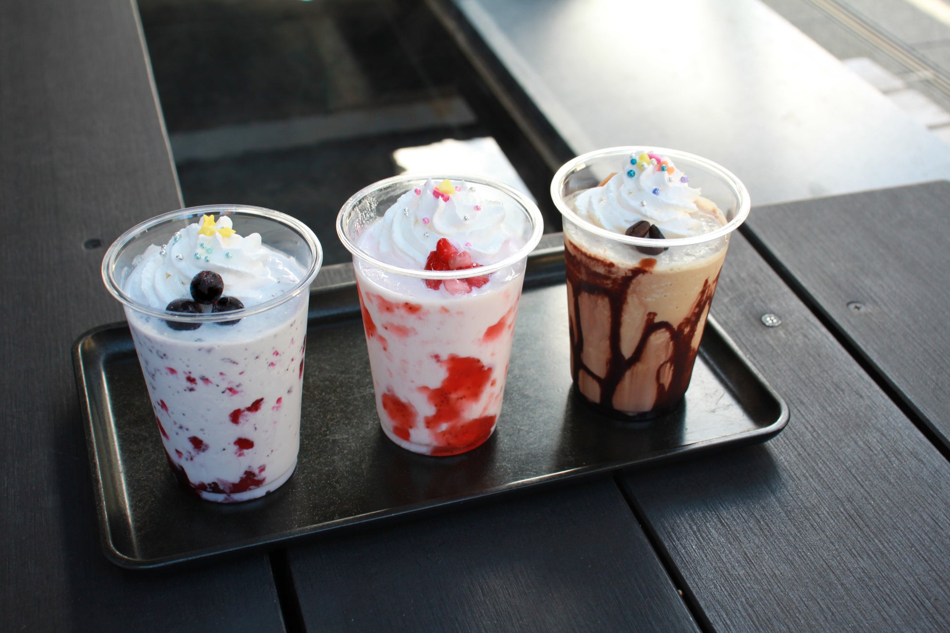 左から佳鏡院:藍映ゆる星しぶき(ブルーベリーシェイク)・御莉姫:苺揺らぐ紅あかり(ストロベリーシェイク)・硝子宮:珈琲香る漆黒きらめき(コーヒーシェイク)
