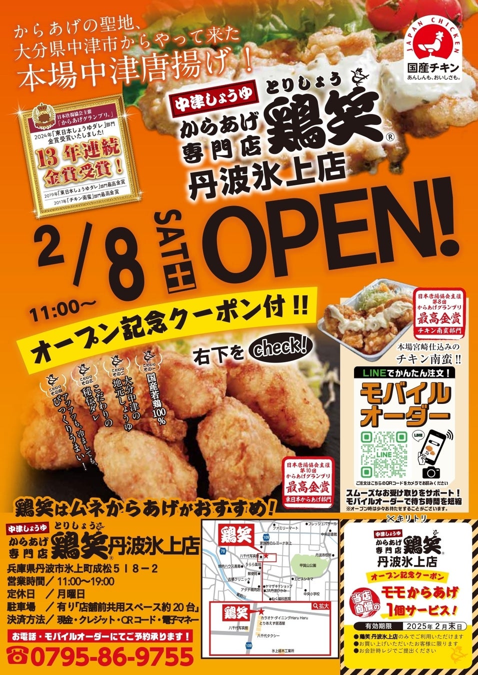 【鶏笑】からあげ専門店「鶏笑(とりしょう)丹波氷上店」2月8日(土)オープン!「モモからあげ1個」がもらえるお得なキャンペーン実施!