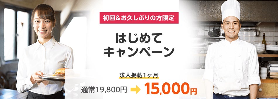 飲食店専門の求人情報サイト「求人@飲食店.COM」にて、求人掲載1ヶ月(通常19,800円)を、今だけキャンペーン価格15,000円(税別)でご提供。