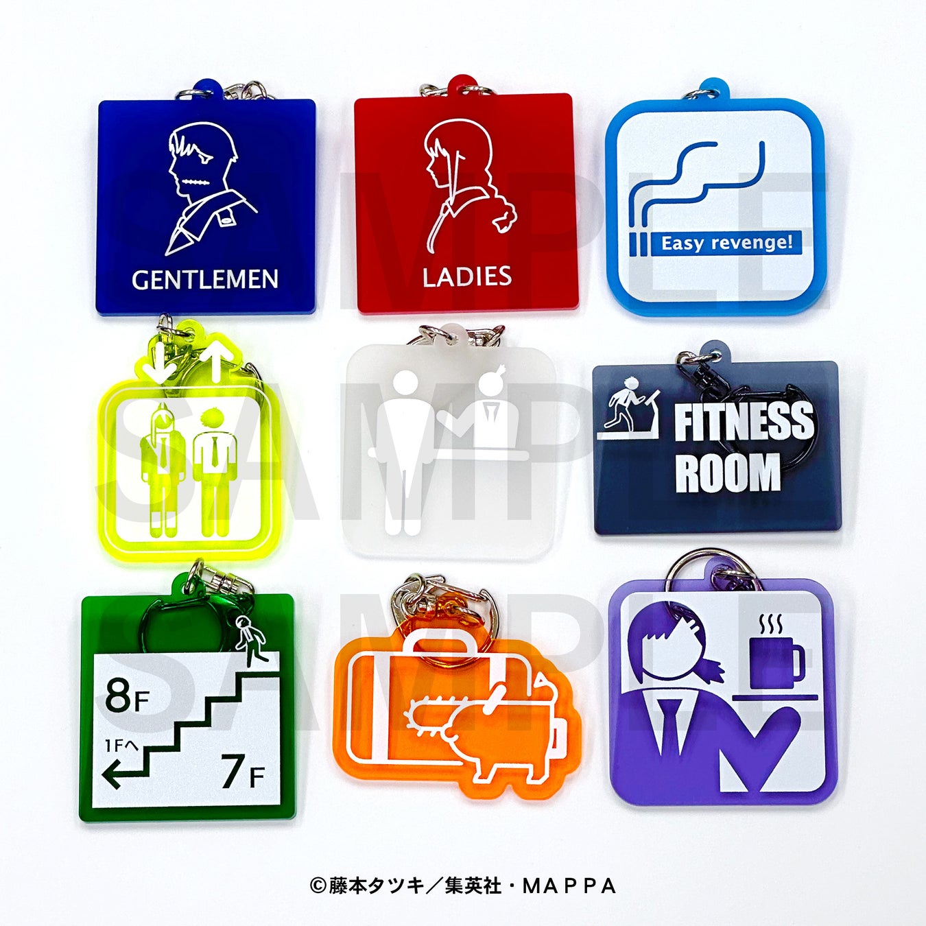 本コラボレーション企画ならではのグッズ。ホテル内で使⽤されている案内サイン表示をチェンソーマン仕様にデザインした、アイコンカラーアクリルキーホルダーです。