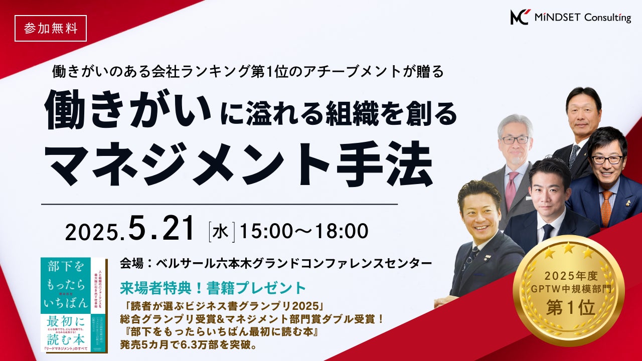 5月21日(水)経営者や大企業の人事担当者を対象としたマネジメントイベント「働きがいに溢れる組織を創るマネジメント手法」を開催します。アチーブメント株式会社は2025年、Great Place To Work® Institute Japanが実施する「働きがいのある会社ランキング(100~999人部門)」で第1位を獲得。イベントでは、代表取締役会長 兼 社長の青木仁志やビジネス書グランプリ2025で総合・マネジメント部門のW受賞をした取締役の橋本拓也らが登壇。生成AIの普及により業務効率が進む一方、組織における“人を育てるマネジメント力”が改めて問われる中、最新のマネジメント手法を紹介します。