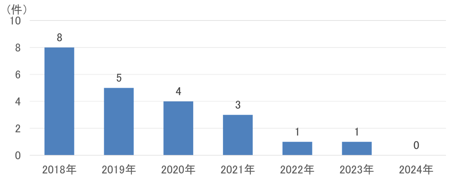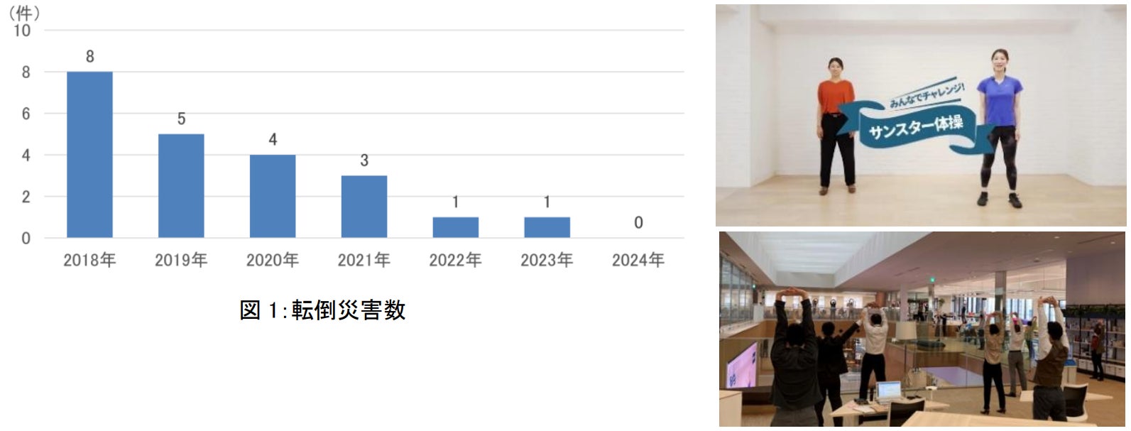 労災、主に転倒事故防止のため、2021年9月には、株式会社ルネサンスの協力により、足腰の強化に重点をおいた「サンスター体操」を開発しました。年齢も体力も違う全ての方々が「安全に」「楽しく」「効果的」に体操を行うことができなければならないと考え、自分で体操レベルを選択できるように通常レベルの「スポーツスタイル」と、やさしいレベルの「オフィススタイル」 2種類の負荷レベルを用意しています。毎朝決まった時間に事業所内だけでなく、オンラインでも動画を流すことで、テレワーク勤務者も自宅で実施できるようになっています。サンスター体操導入後は、転倒災害は減少傾向にあり、2024年には0件となりました(図1)。