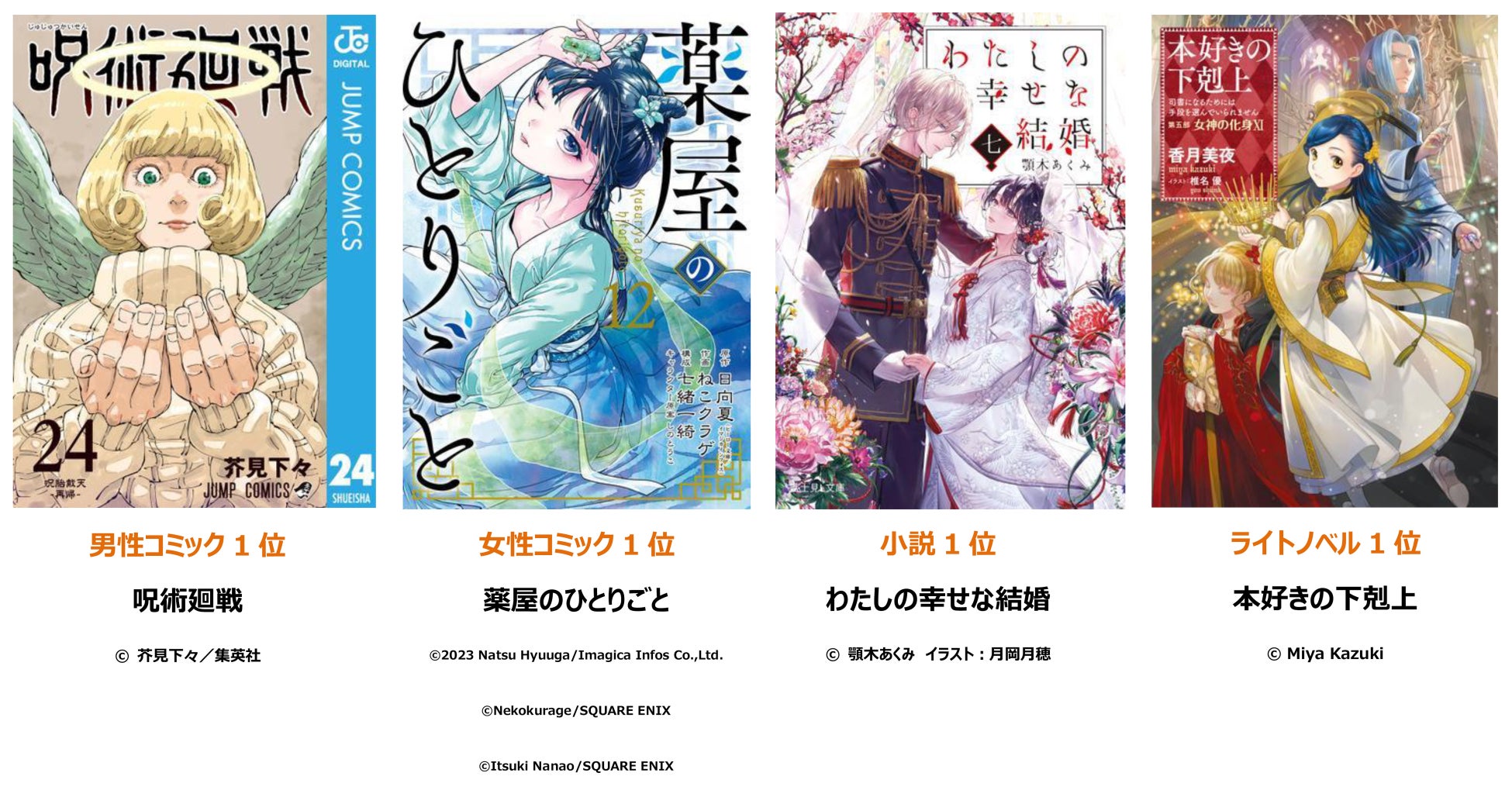 今年TVアニメや映画、メディアでも話題となった人気作品『呪術廻戦』『薬屋のひとりごと』『わたしの幸せな結婚』『本好きの下剋上』など、「auブックパス」の男性コミック、女性コミック、小説、ライトノベルほか全11ジャンルより、各TOP10を発表いたします。今年のランクイン作品をチェックして、年末年始に読む本の参考にしてみるのはいかがでしょうか。