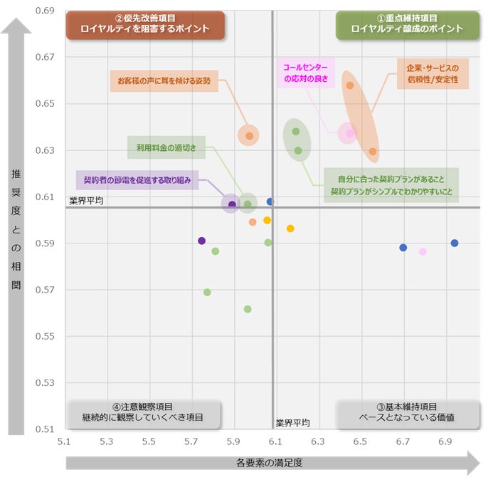 一方でロイヤルティを向上させるために優先的に改善が期待される項目としては、「利用料金の適切さ」や「お客さまの声に耳を傾ける姿勢」があがりました。また、「契約者の節電を促進する取り組み」においても今後の改善が期待される結果となりました。