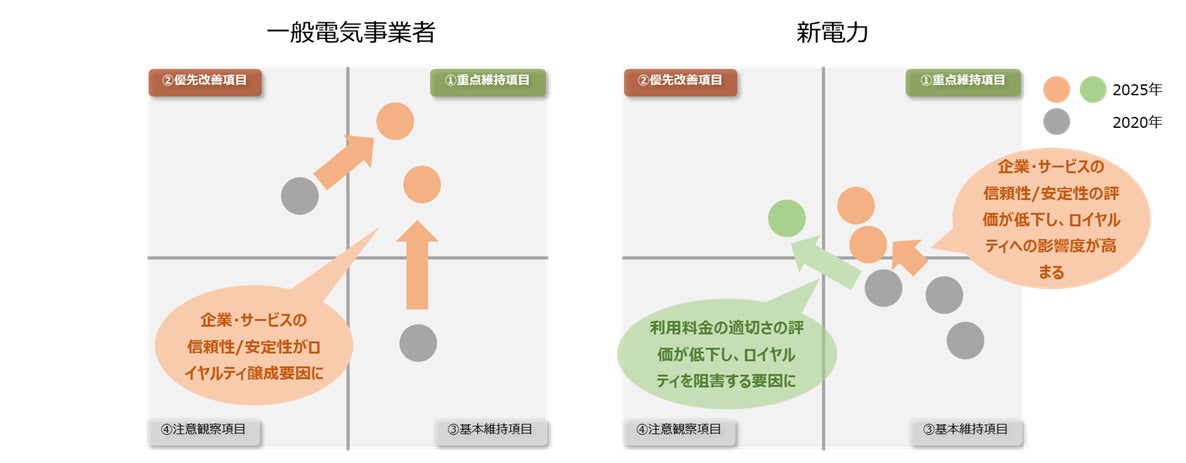 一般電気事業者と新電力におけるNPSの変化の要因を分析したところ、一般電気事業者においては2020年と比較して「企業の信頼性/ブランドイメージ」や「サービスの信頼性/安定性」のロイヤルティへの影響度が高まり、NPS向上の要因となりました。一方で新電力においては、「利用料金の適切さ」の評価が低下し、ロイヤルティを阻害する要因に移行しました。また、「企業の信頼性/ブランドイメージ」や「サービスの信頼性/安定性」の評価が低下し、かつロイヤルティへの影響度が高まったこともNPS低下の一因とみられます。