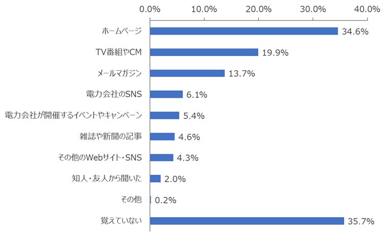 また、電力会社のSDGsの取り組みについて、どのようにして知ったかどうかを調査したところ、「ホームページ」(34.6%)が最も高く、次いで「TV番組やCM」(19.9%)、「メールマガジン」(13.7%)が続きました。ホームページ等を通じて、SDGsの取り組みについて発信していくことの重要性が示唆される結果となりました。