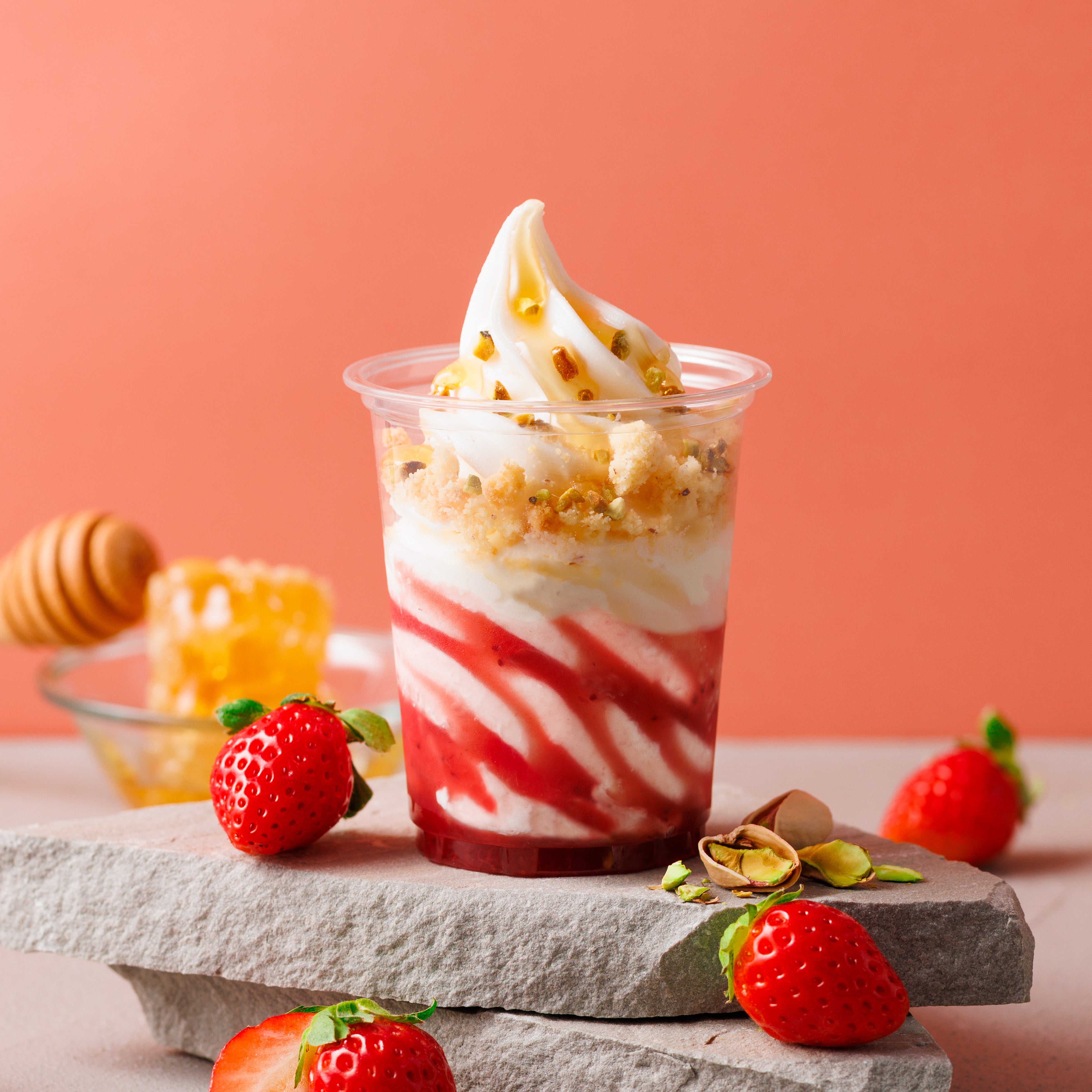 ミルキーなソフトクリームに、甘酸っぱいいちごソースを合わせたオリジナルの味わい。当店人気の焼き菓子「バタークッキー」のクラッシュと、ローストピスタチオを散りばめ、さらに香り豊かなはちみつをとろりとかけた、この冬だけの特別なシェイクです。