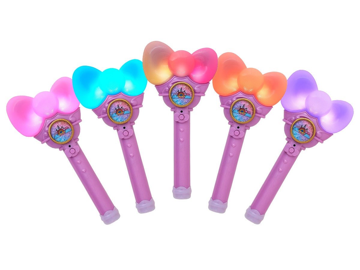 中央に付いている「ワンダーリボンライト ジュエル」はお気に入りのパーツにカスタマイズしてお楽しみいただけるほか、館内の持ち歩きにも便利な「ネックストラップ」も登場するなど、自分だけのカスタマイズも可能です。ハローキティたちと一緒に、ワンダーリボンライトを振って冒険へ出かけましょう。