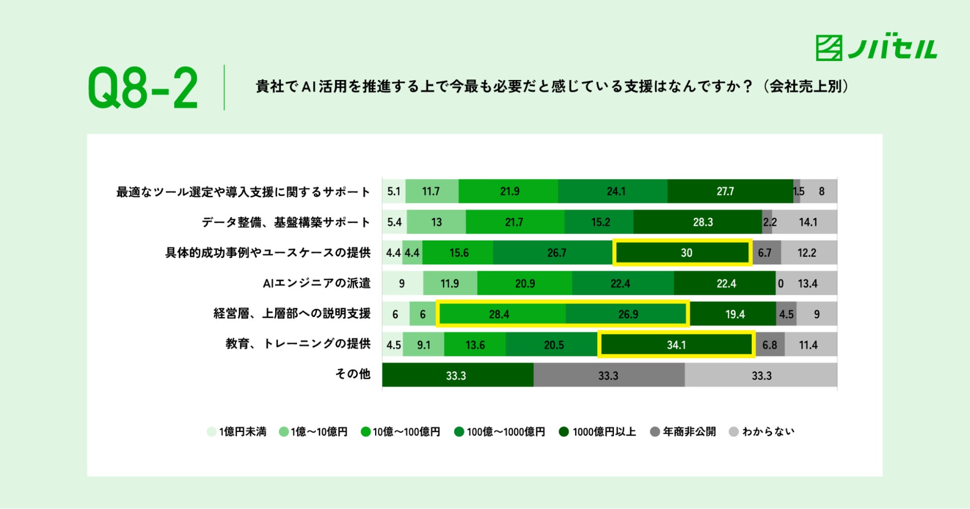 8.AI活用を推進する上で今最も必要だと感じている支援は、導入サポートとデータ整備、基盤構築サポート
