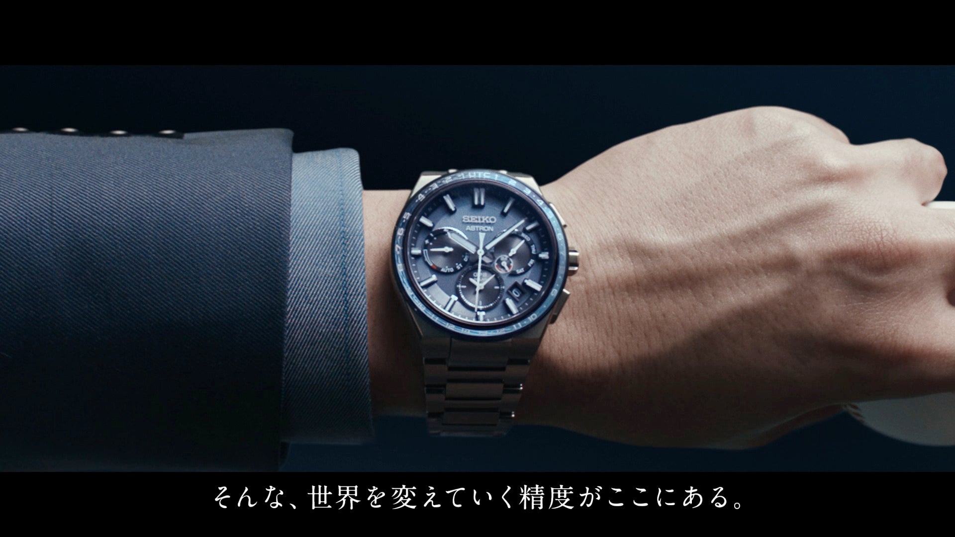 本CMに登場する時計は『<セイコー アストロン> Nexter シリーズ GPSソーラーモデル』で、スタイリッシュに仕上げたソリッドなケースに、ラグジュアリーな輝きを放つサファイアガラスベゼルが特徴です。