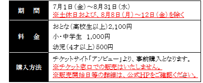 | ■土休日および8月6日(土)~14日(日)は、日時指定のWEB前売入場券が必要です。 対象日:【7月】2(土)・3(日)・9(土)・10(日)・16(土)・17(日)・18(月・祝)・23(土)・24(日)・30(土)・31(日) 【8月】6(土)~14(日) ※8月15日(月)以降は、公式HPにてお知らせいたします。 ※チケットに関する詳細・購入は公式HPをご確認ください。 |