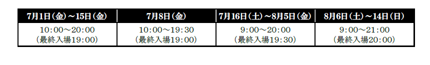 | ◆開催時間(各回約15分間) 【7月1日(金)~15日(金)】 11:30/13:00/14:30/16:00/17:30(5回) 【7月16日(土)~8月5日(金)】 10:30/12:00/13:30/15:00/16:30/18:00(6回) 【8月6日(土)~14日(日)】 10:00/11:30/13:00/14:30/16:00/17:30(6回) ※8月15日(月)以降の開催時間は公式HPにてお知らせいたします。 |