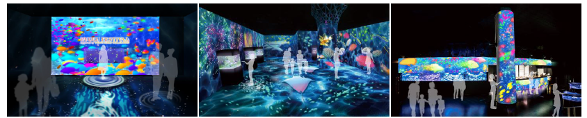 「アマノガワテンジクダイ」や「へコアユ」など、群れを成す魚たちの動きを“花火”に見立て、その生態をお伝えするインタラクション。壁面に並ぶ4種の水槽前の足元にはバブルが浮かんでおり、そこに立つことでそれぞれの魚たちのシルエットが集まり、花火が打ちあがります。