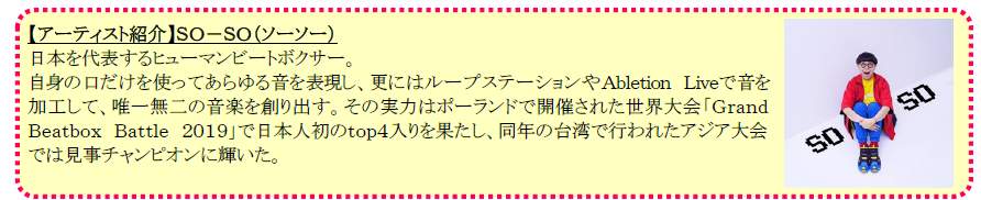 日本を代表するヒューマンビートボクサー『SO-SO』氏による楽曲。イルカ・オットセイ・ペンギンなど、アクアパークでくらす8種類の生きものの“声”を実際に収録し、環境音や自身のヒューマンビートボックスと組み合わせて制作されました。同プログラムではイルカだけでなく、さまざまな生きものたちが“声”によって共演を果たします。