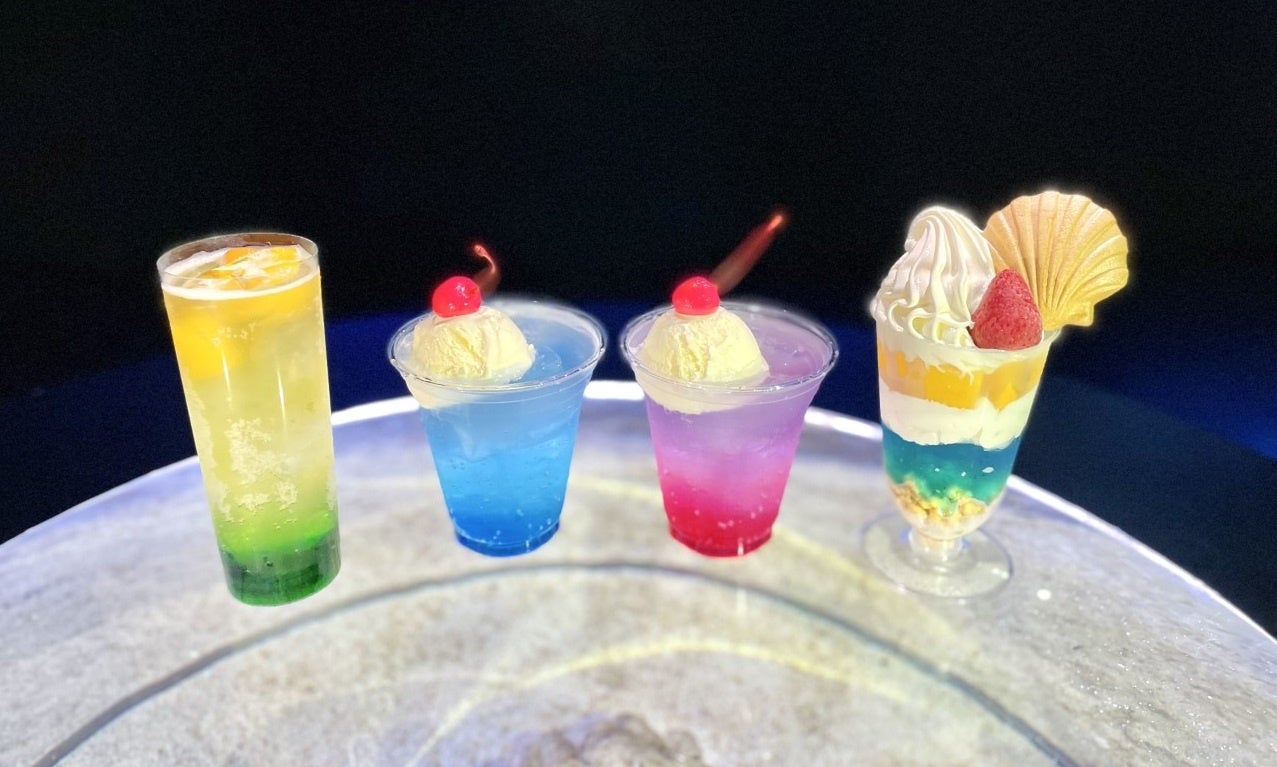 発光サンゴの水槽が連なるカフェバーは、透明感あふれる水面のパターンとトロピカルな色彩のデジタルフラワーにつつまれて“宴”のシーンを創出します。エリア内はゲストの来訪を歓迎するように映像の魚たちが回遊。その軌跡には花びらが舞い、空間に華やかさを添えます。さらにこちらでは、“RYUGU”の世界観をイメージしたカラフルな2種のクリームソーダやパフェなど、イベント限定メニューをご用意しました。生きものと映像演出が織りなす美しい景観の中で、ドリンクを片手に非日常のひと時をお過ごしいただけます。