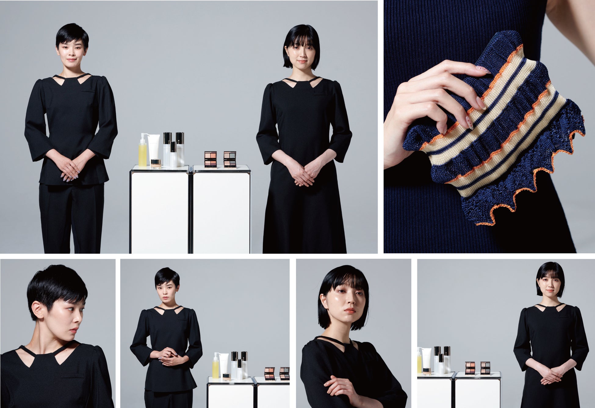 今回のコラボレーションでは、素材やデザインによって新たなエレガンスを表現しているmalamuteと、モード、そしてファッション性を提案するLUNASOLが、ファッションとビューティーの側面から、強く、エレガンスに、たおやかに生きる新しい現代女性をイメージし、LUNASOLのユニフォームと、オリジナルポーチをデザイン。今回特別にデザインされたユニフォームは、LUNASOLのコンセプト「EGOISTIC-CHIC」をもとに、デザイナーの小高氏が、malamuteの代名詞のニットを使用し、モノトーンでエレガントな曲線美がアクセントになったユニフォームをデザインしました。また、オリジナルでデザインされたポーチは、malamute22AWコレクションの金木犀の花柄ニットをモチーフに、LUNASOLの9月発売新作コレクション「Fragment of the Earth」から着想を得たネイビー、ベージュ、オレンジの3色ボーダーで表現。デイリーに使えるデザインとなっています。