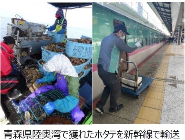 | ○日本ホテル株式会社(本社:東京都豊島区、代表取締役社長:里見雅行、以下「日本ホテル」)と東日本旅客鉄道株式会社(本社:東京都渋谷区、代表取締役社長:深澤祐二、以下「JR東日本」)は連携して、JR東日本グループが展開する列車を活用した荷物輸送サービス「はこビュン」で輸送した、青森県陸奥湾産 活ホタテを使用したメニューを提供します。 ○2022年6月10日から7月29日の期間、東北新幹線はやぶさ16号にて新青森駅から東京駅まで新鮮な活ホタテを輸送します。青森県陸奥湾産 活ホタテは食物性プランクトンが豊富な自然環境の中で漁業者が大切に育てており、他にはないまろやかな甘味と肉厚な身が特徴です。 ○今後も日本ホテルとJR東日本は連携して、季節の鮮魚や甲殻類といった魚介類などを「はこビュン」で輸送し、日本ホテルが運営するホテルのレストランにて提供していきます。 |