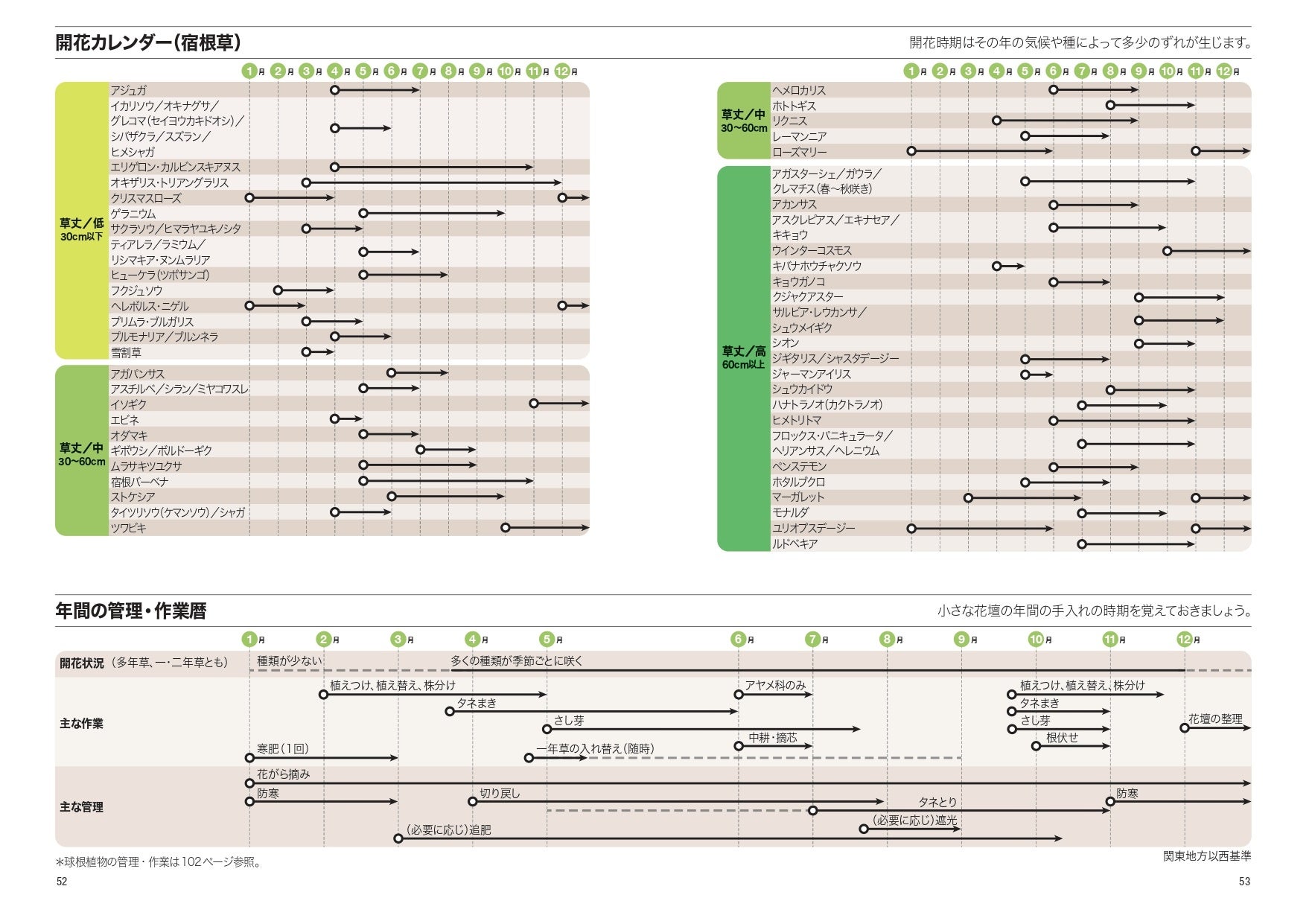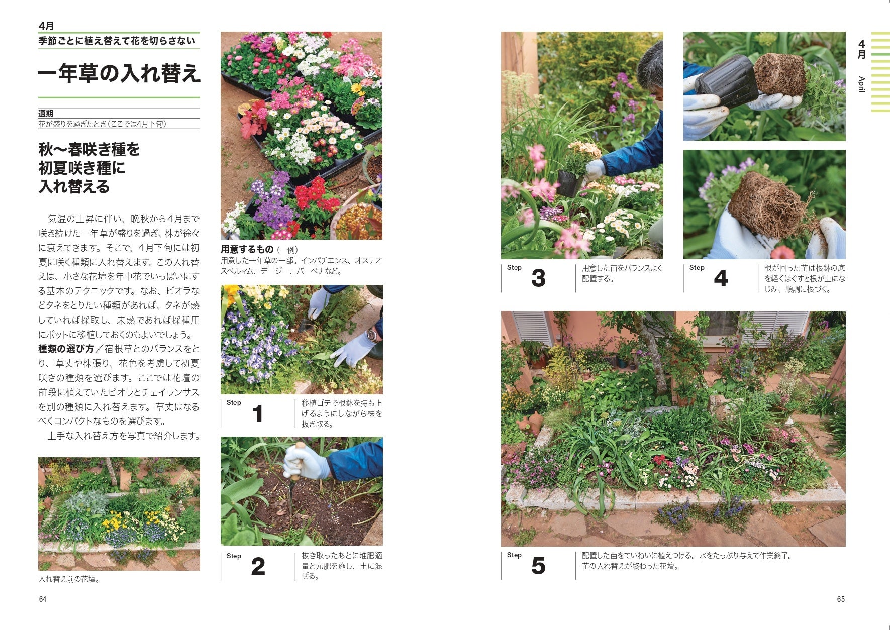 小さな庭のつくり方を、初めての方でもわかりやすいように丁寧に紹介している本書。まずは、自分の庭の日当たりを踏まえた植栽プランの立て方からはじまります。一年中、花が絶えない花壇となるように開花時期を参考に、手前から低中高と草丈がバランスよく配置するコツをお教えします。