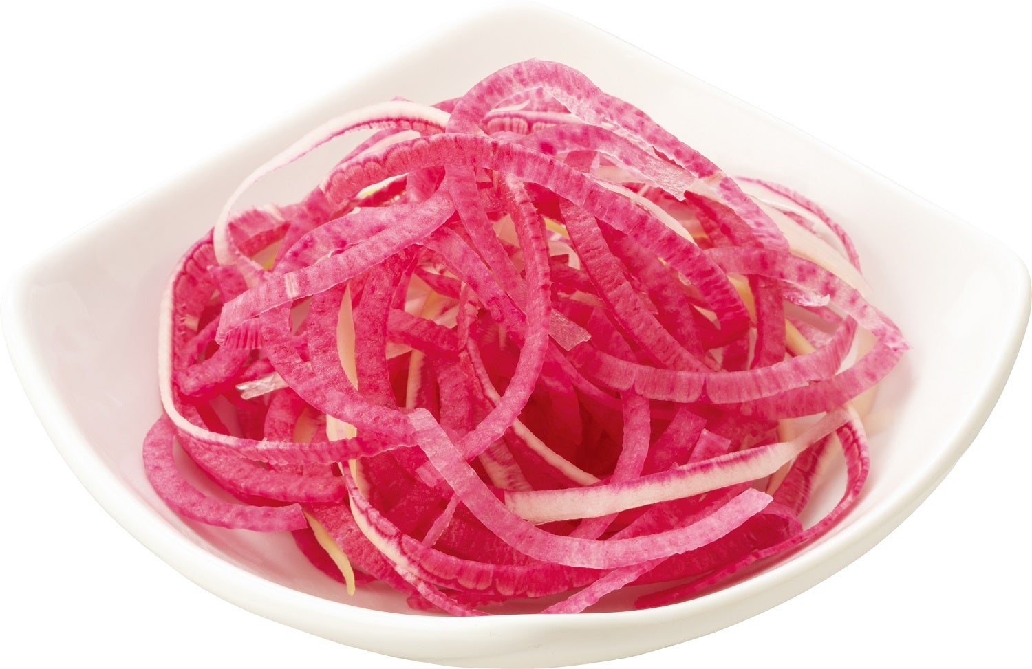 辛みが少なく、ほんのり甘いのが特長。ピンク色でだしをかわいく彩り、くるくるとした形にカットすることでだしがよく絡みます。