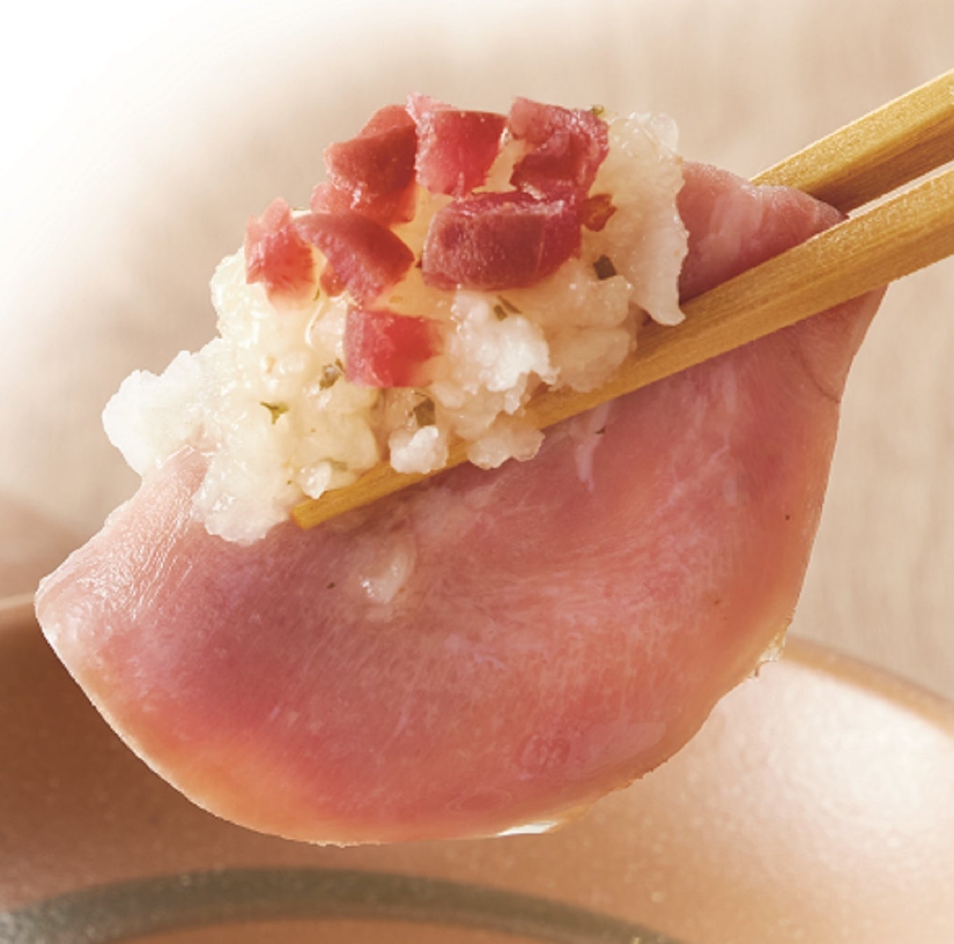 だしは、職人が手作業で作り上げる鰹節“手火山式本枯節”と紀州南高梅を加え、コク深い鰹の旨みと梅の爽やかな香りが感じられるよう仕上げました。鍋の中に梅干しが1つ入っていますが、さらに梅感を強めたい方に向けて、1個税込110円で梅干しをご用意。鍋の中で潰しながら、自分好みの梅感でしゃぶしゃぶをお楽しみいただけます。