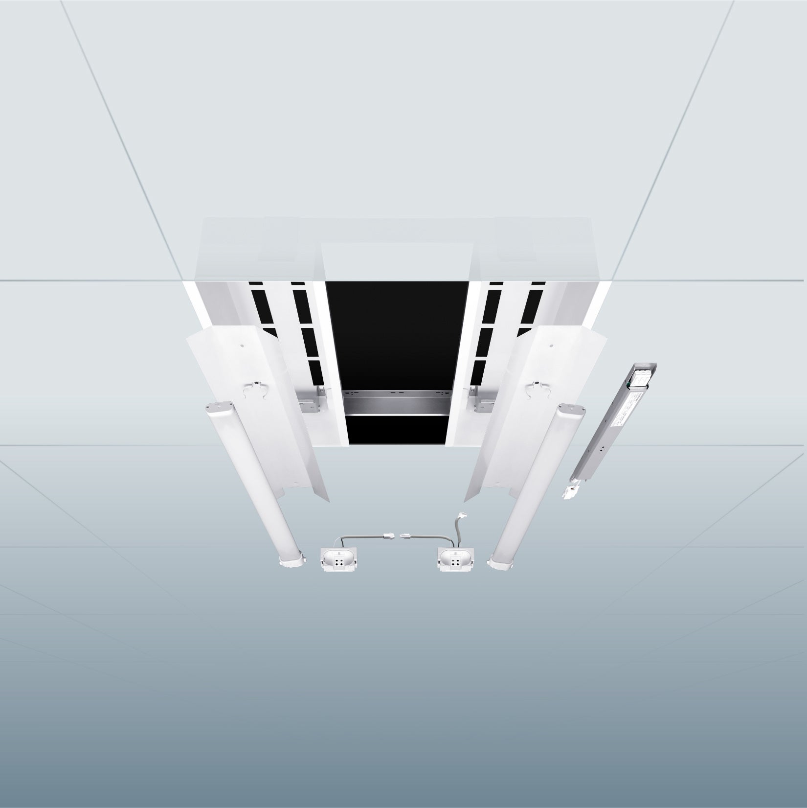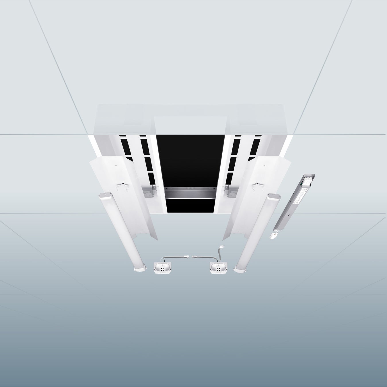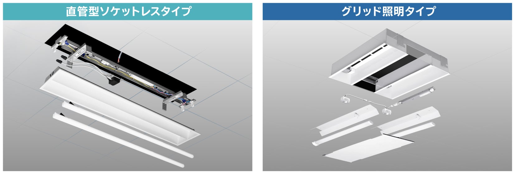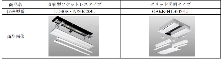 ・直管型ソケットレスタイプとグリッド照明タイプの2種類で、オフィスビルに多い直管型蛍光灯やコンパクト蛍光灯型に対応します。