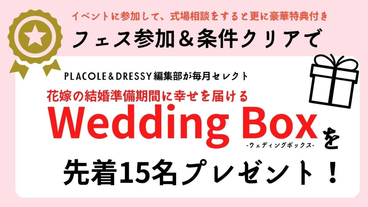 更に、先着15名さま限定で1万円相当のアイテムが入ったウェディングボックスをプレゼント。結婚式当日までの間、花嫁さまの結婚式準備を楽しく、ワクワクしたものになるように、花嫁さまがちょっとでも、幸せを感じていただけるようウェディングボックス作りました。