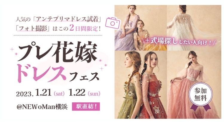 「PLACOLE & DRESSY」ブランドを展開する、冒険社プラコレ(本社:神奈川県鎌倉市、代表取締役CEO:武藤功樹)は、横浜駅直結JR横浜タワー21F、ウェディングの魔法にかかる空間"DRESSY ROOM YOKOHAMA"にて、2023年1/21(土)1/22(日)の2日間これから結婚式をお考えのカップル様に向けた、アンテプリマドレス試着・スタートドレスフォトもできるプレ花嫁ドレスフェスを日程限定で開催お知らせいたします。