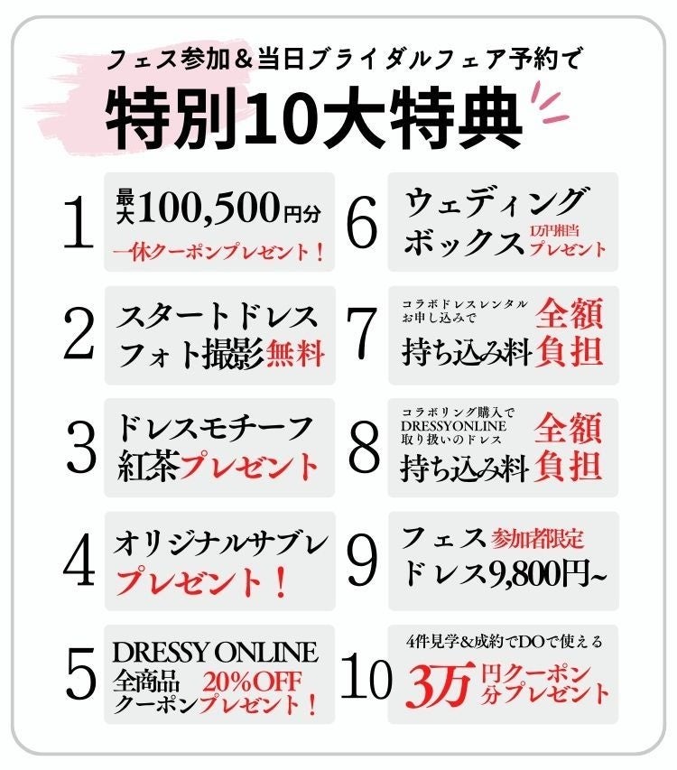 なんと今回のフェスは、同日にウェディングドレス新年初売りセールを実施!高品質で可愛いウェディングドレスが30着限定で9,800円でご購入いただけたり、フェス参加するだけでDRESSYONLINE掲載の商品がすべて20%OFFで購入いただける、クーポンの発行もさせていただきます。