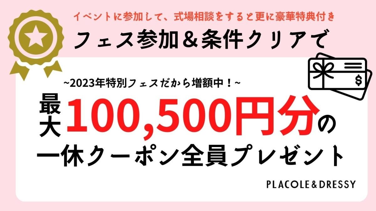 今回のプレ花嫁ドレスフェスは特典が盛りだくさんなんです。お正月だから増額中の最大100,500円分のクーポンは、なんと条件クリアで全員にプレゼント中。レストランやホテルの宿泊でご利用いただけるクーポンはこれからの結婚式準備の束の間のひとときに癒しとステキな時間を過ごしていただきたいと思いご用意しました。