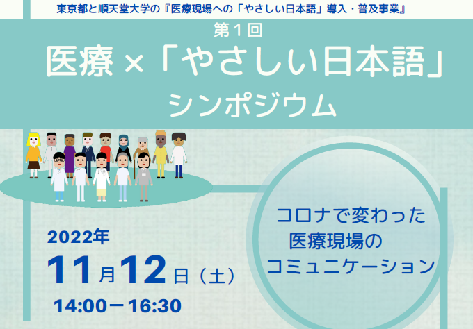 順天堂大学では、東京都との『医療現場への「やさしい日本語」導入・普及事業』の一環として、「コロナで変わった医療現場のコミュニケーション」をテーマにした『第1回 医療×「やさしい日本語」シンポジウム』を2022年11月12日(土)に開催します。