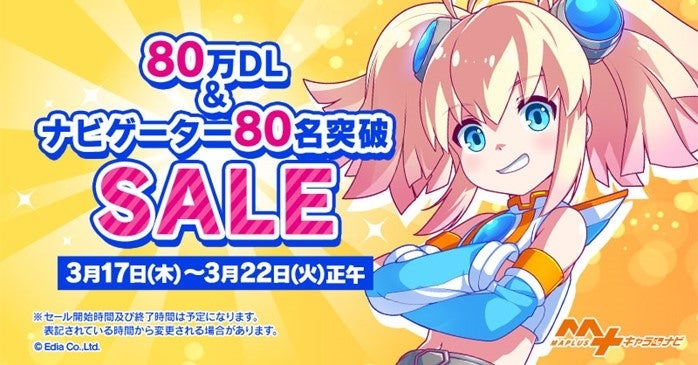 株式会社エディア(本社:東京都千代田区、代表取締役社長:賀島 義成、以下:エディア)は、当社が運営する徒歩・カーナビアプリ『MAPLUSキャラdeナビ』にて、「80万DL&ナビゲーター80名突破記念SALE」を2022年3月10日(木)から開催することをお知らせいたします。