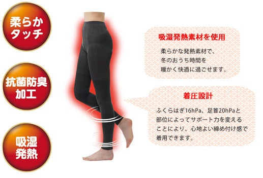 「履いて寝て翌朝スッキリ着圧シリーズ」よりレギンス、オーバーニー、ゲーターの3アイテムを展開。柔らかなアクリルレーヨンの発熱素材を使用し、ふくらはぎから足首にかけて着圧機能をもたせたことで、心地よい締め付け感で着用できます。秋冬のリラックスタイムを暖かく快適に過ごし、1日頑張った足にご褒美を。