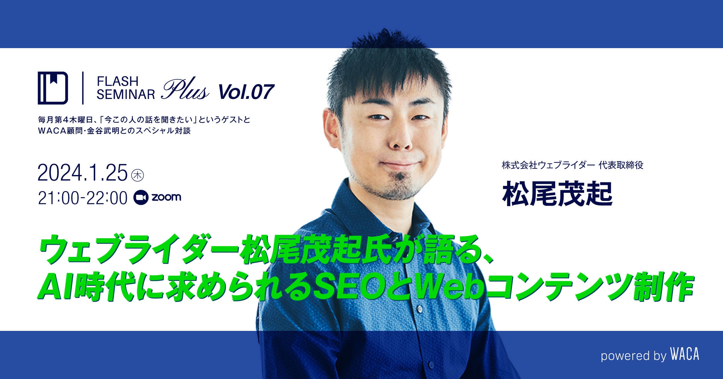 2024/1/25(木)21:00 - 22:00 FlashセミナーPlus Vol.07 ウェブライダー松尾茂起氏が語る、AI時代に求められるSEOとWebコンテンツ制作