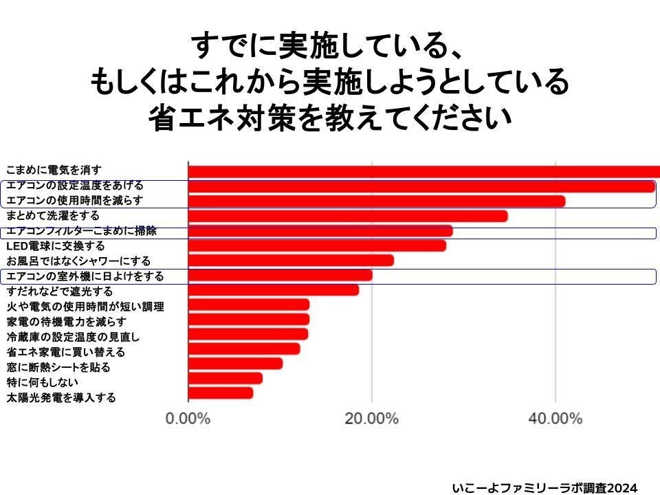 また、「エアコンの設定温度をあげる」や「エアコンの使用時間を減らす」といった、消費電力が多いエアコンの省エネ対策が上位を占める結果になりました。