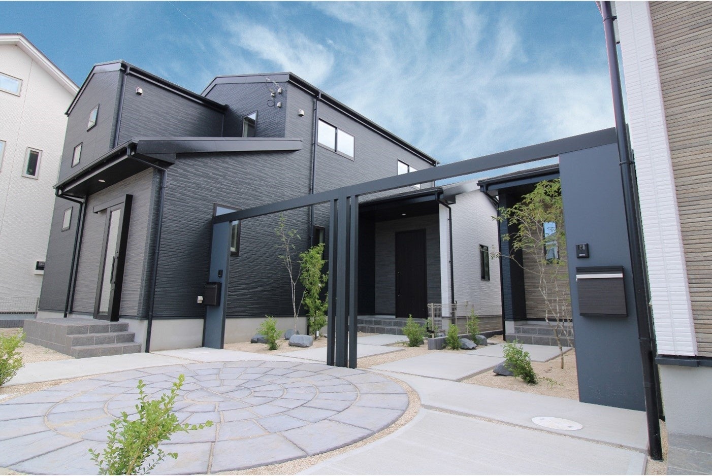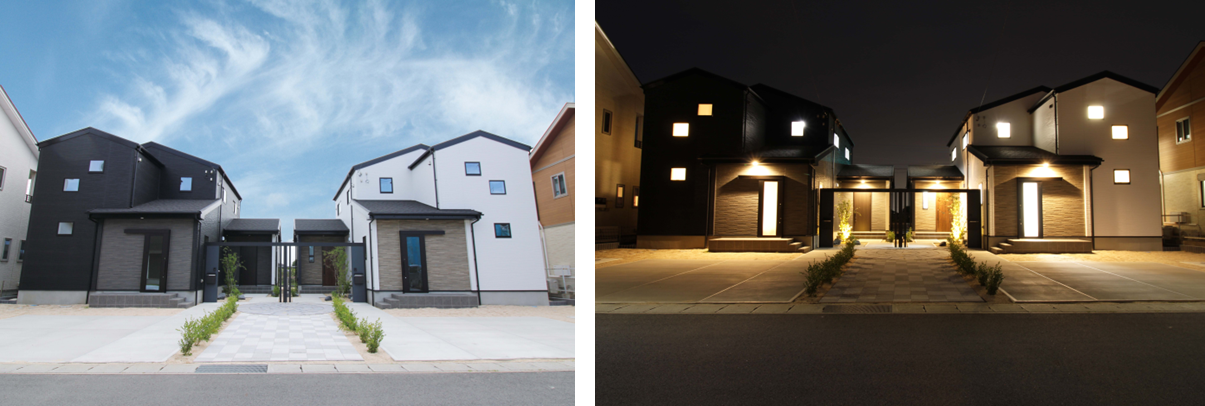 本物件は「小さなおとなりさんコミュニティを意識した分譲住宅」をテーマに、住人が周辺地域との最初のコミュニティは可能な限り小さく、かつ同じ分譲地内のコミュニティからスタートできるよう外構を2棟で1つのデザインとしました。全ての外構計画の要素として共通点を持たせ、シンメトリックデザインを意識し、程よく囲われている雰囲気と解放感も2棟で1つの演出となるよう設計しました。おとなりさん同士のさり気ない挨拶から会話、コミュニケーションへと繋がるきっかけをこの外構計画にプロットしています。