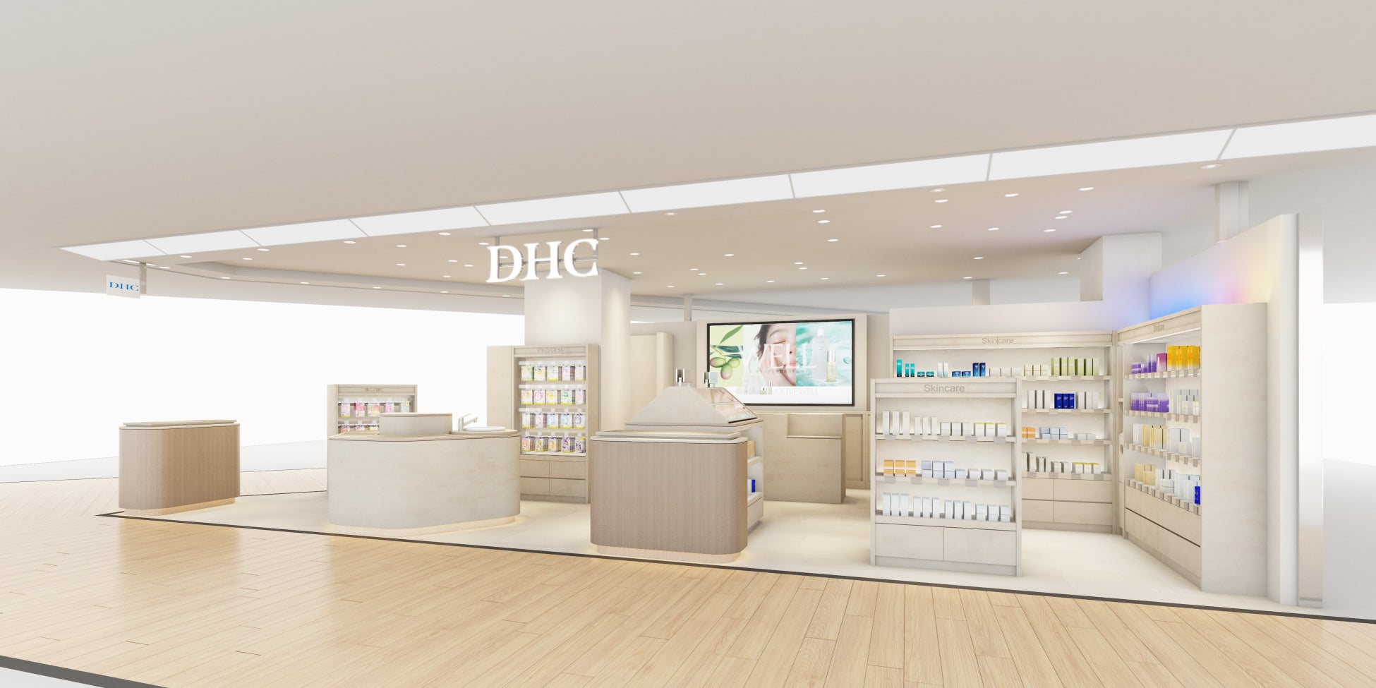 このたびの店舗リニューアルでは、昨年より展開している新店舗と同様に、多様性を表現したミックスカラーグラデーションと曲線デザインの内装を基調とし、幅広いお客様に親しみを感じていただける空間へと一新します。また、DHC直営店としては初めて、DHCの世界観を表現することを目的に、店内に大型のデジタルサイネージを設置しました。