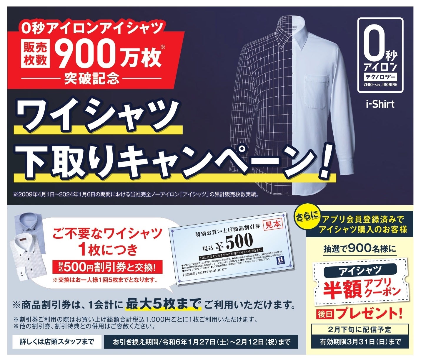 『i-Shirt(アイシャツ)』シリーズ累計販売枚数900万枚突破を記念してキャンペーンを実施いたします。アイシャツがお客様に愛される理由をより多くの方へご体感いただきたいという思いから、ご自宅にある不要なワイシャツをはるやま店舗にお持ちいただくと、店内商品のご購入時に使用可能な割引券と引き換えいたします。