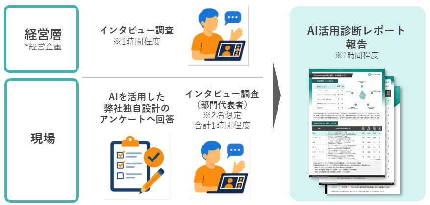 生成AIを業務に活かすために、どの部署で・どのように導入すべきかを可視化し、最適な活用方針と“最初の一歩”を明らかにする診断サービスです。経営層・現場・情報システム部門へのヒアリングとアンケートを通じ、最適な初動方針を提示します。