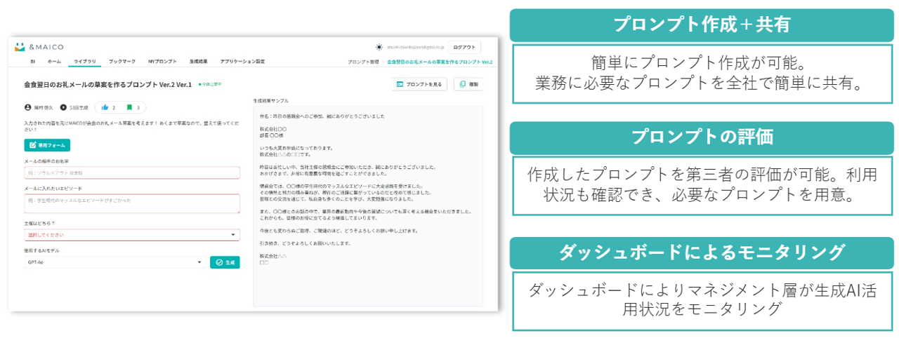 社内のAI活用を加速するための「AIの社内ポータル」です。プロンプト管理と利用状況の可視化を一元化。誰もが安全にAIを使える環境づくりを支援します。