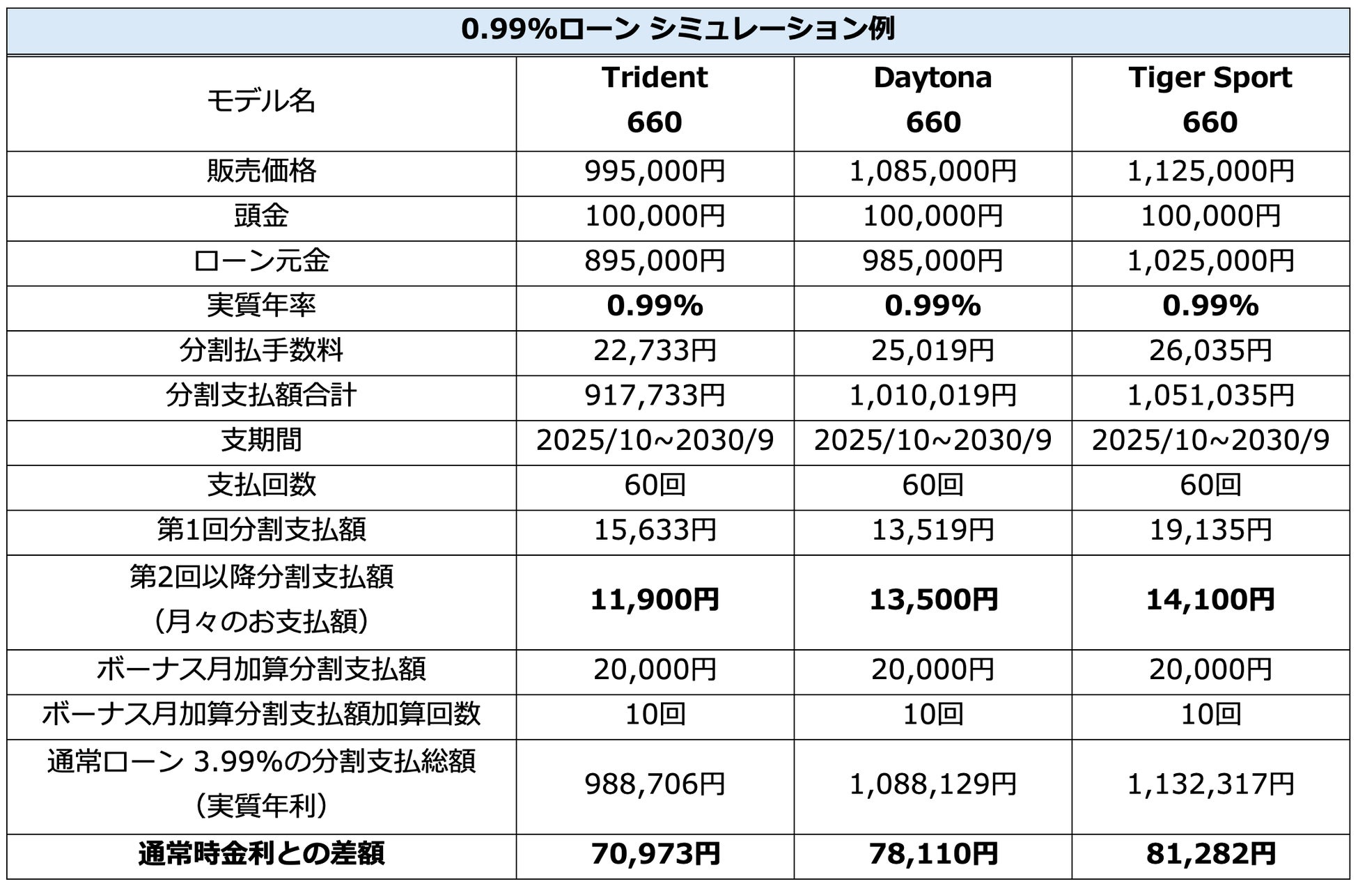 内容:キャンペーン期間中、全国のトライアンフ正規販売店にて対象車両をご成約、且つローン契約を完了していただいたお客様に、「0.99% 特別金利ローン」をご提供します。