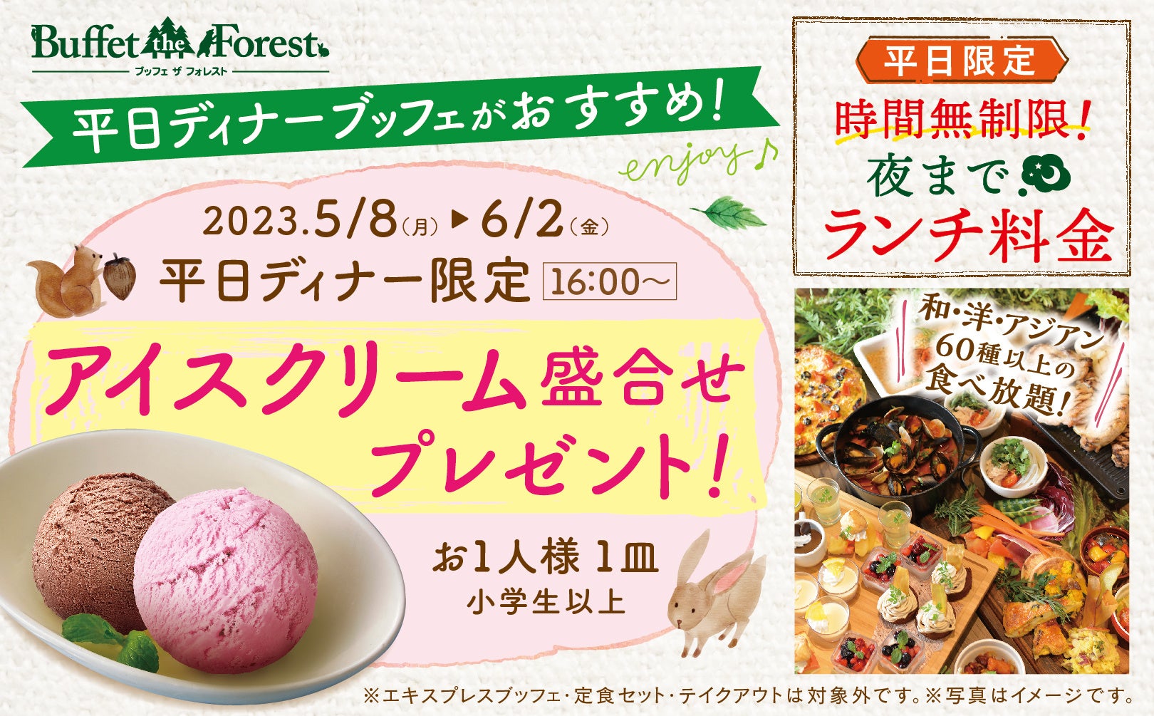 【平日ディナー特別企画!】平日はとってもお得!『時間無制限』更に終日ランチ料金で楽しめる“ブッフェ ザ フォレスト入間店”にて5/8(月)より開催!平日ディナー限定『アイス』プレゼントキャンペーン!