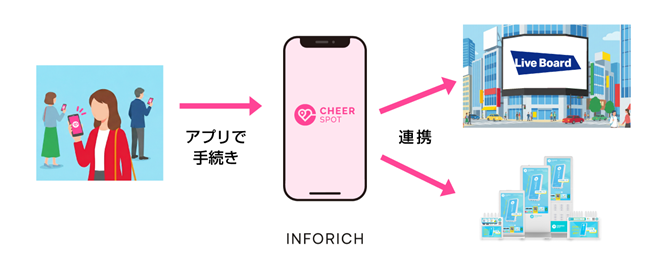 「応援広告」は、個人のお客さまが、好きなアーティストやタレントなど “推し”を応援するために、広告を出稿するもので、アーティストやタレントなどの誕生日や新曲発売といった節目のタイミングに掲示されることが多く、近年注目を集めています。今回の協業により、INFORICHが運営する「 CheerSPOT™(以下、チアスポット)」に登録されているアーティストの中から、出稿したいアーティストを選択することで、LIVE BOARDが保有する全国の屋外ビジョンへ、応援広告を掲出できるようになります。なお、「チアスポット」では、版権元公認の公式画像素材を使用できるため、著作権の心配なく、個人のお客さまがスマートフォン一つで簡単に応援広告をデジタルサイネージなどへ掲出可能となります。まず、チアスポットWeb版アプリで機能を公開し、iOS/Android版アプリは順次公開を予定しています。