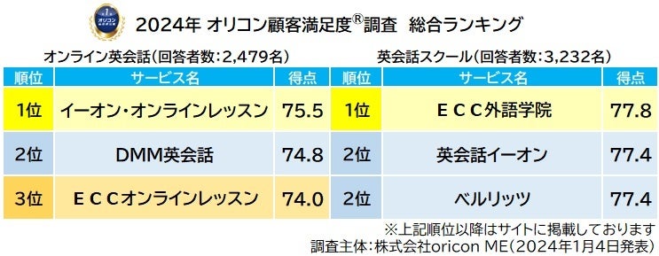 総合2位は【英会話イーオン(株式会社イーオン 本社:東京都新宿区)】と【ベルリッツ(ベルリッツ・ジャパン株式会社 本社:東京都新宿区)】が同点でランクインしました。