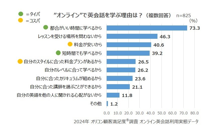 また、「自分の英語を他の人に聞かれる心配がないから(11.8%)」というオンラインの特性を活かした理由で学ぶ人もいることがわかりました。